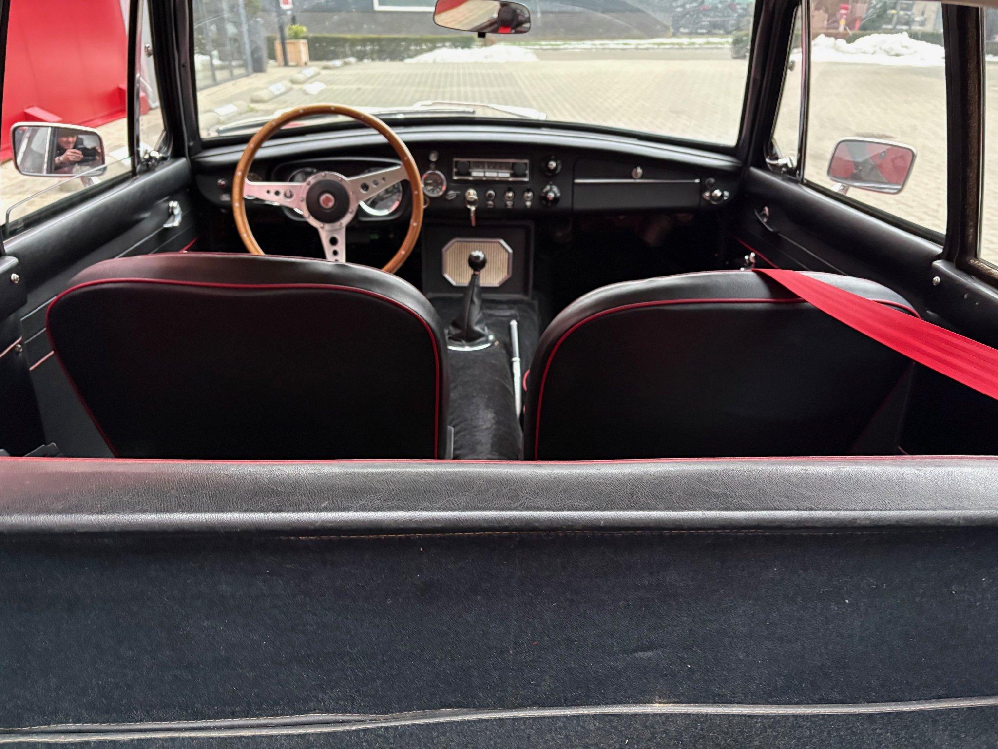 Kleur Tartan Red met een zwart interieur met rode bies. Zwarte vloerbekleding en een nette schone witte hemelbekleding.