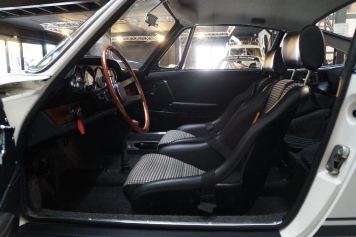 The exterior carries its striking Light Ivory and gold detailing with understated confidence. Inside, the cabin balances period-correct sportiness with timeless elegance. A beautiful wooden steering wheel and matching wooden interior trim set the tone, while the original black leather provides an authentic foundation. Period-correct Recaro racing seats with pepita inserts and an “Autoflug” racing harness complete the package – details that speak directly to Porsche’s motorsport DNA.