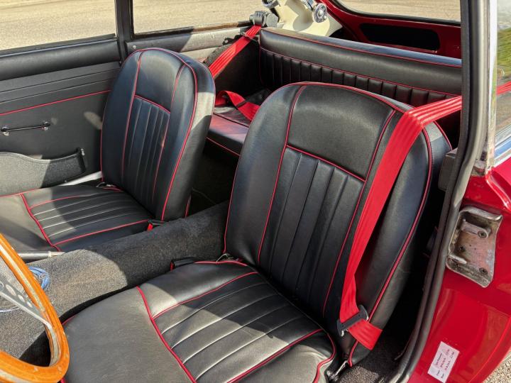 Er zijn fraaie rode veiligheidsgordels gemonteerd. Voor de voorstoelen en ook voor de achterbank.