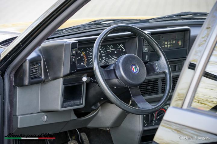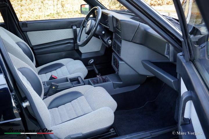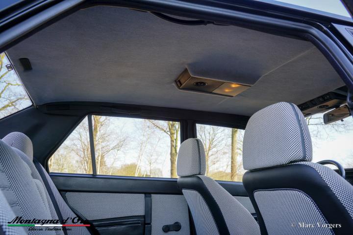 De zo goed als nieuwe stoelen zijn bekleed met geruite stof (zeer lichtgrijs en donkergrijs) met donkergrijze lederen accenten op de zijsteunen van de voorstoelen. Deze schitterende Alfa Romeo 75 Turbo werd nieuw verkocht in Italië.