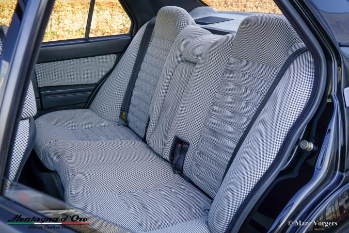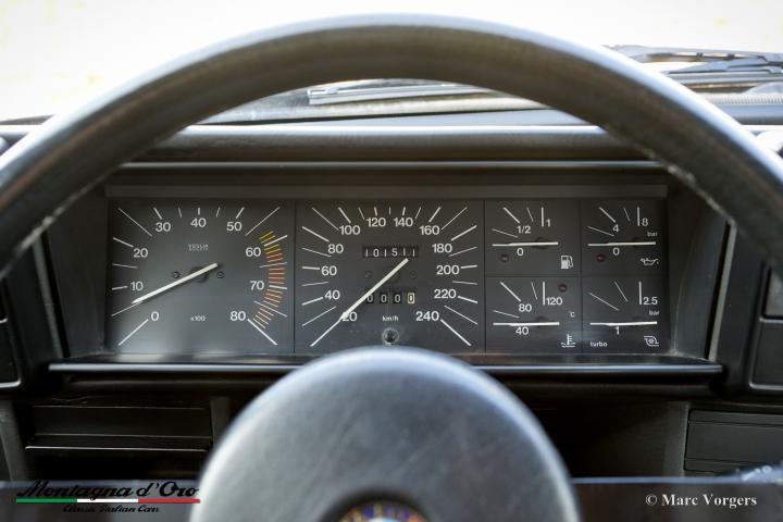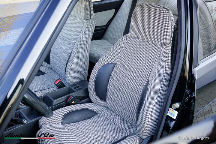 De zo goed als nieuwe stoelen zijn bekleed met geruite stof (zeer lichtgrijs en donkergrijs) met donkergrijze lederen accenten op de zijsteunen van de voorstoelen. Deze schitterende Alfa Romeo 75 Turbo werd nieuw verkocht in Italië.
