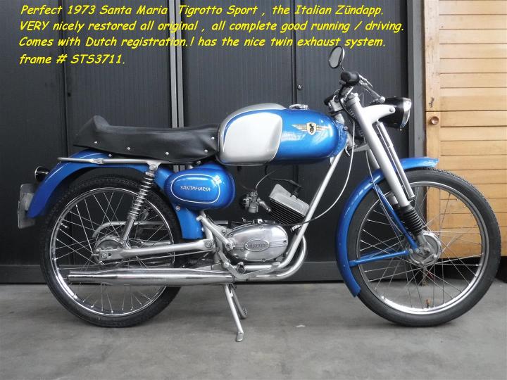 Perfecte 1973 Santa Maria Tigrotto sport, de Italiaanse Zundapp. Heel netjes gerestaureerd naar origineel. Compleet en goed rijdend. Met NL kenteken. En heeft de mooie dubbele uitlaat. Grootste keus in ECHTE klassiekers met meer dan 450 stuks in "de Stolze Collectie", van project tot perfect !