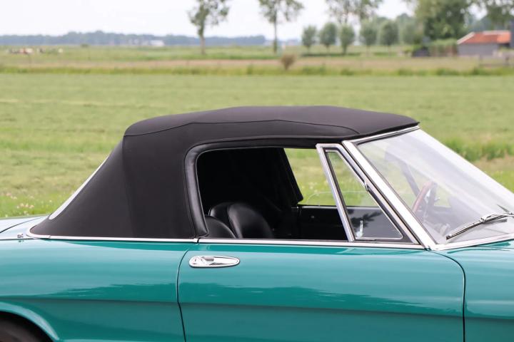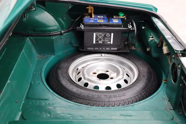 The beautiful black interior is also a true work of art and is in good condition. The interior features attractive gauges, a radio, heating and Kenwood speakers. The seats and doors have been reupholstered with black leatherette. The seats are original European models without headrests, unlike American models. The car is driven by the beautiful wooden 3-spoke steering wheel. The interior is free of significant damage and is in overall good condition. The boot is surprisingly spacious and is also in good condition. The spare wheel is neatly covered under the renewed boot mat.