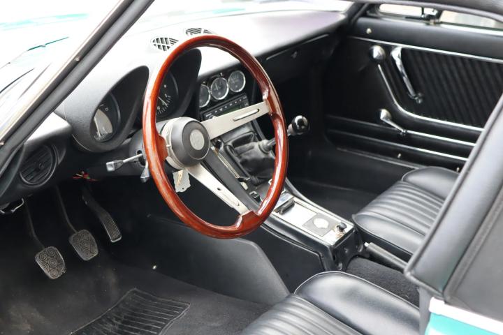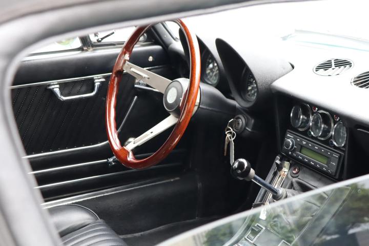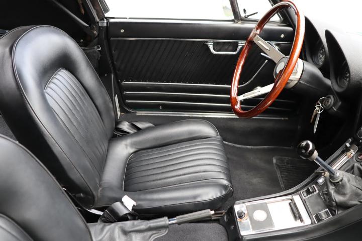 Ook het fraaie zwarte interieur is een waar kunstwerk en verkeert in een nette staat. Het interieur beschikt onder meer over fraaie tellers, een radio, verwarming en Kenwood speakers. De stoelen en deuren zijn opnieuw bekleed met zwart skai-leer. De stoelen zijn origineel Europees uitgevoerd zonder hoofdsteunen, in tegenstelling tot Amerikaanse modellen. De auto laat zich besturen door het fraaie houten 3-spaaks stuurwiel. Het interieur is vrij van noemenswaardige beschadigingen en verkeert in algehele nette staat. De kofferruimte is verrassend ruim en verkeert eveneens in een nette staat. Keurig afgedekt onder de vernieuwde koffermat bevindt zich het reservewiel.