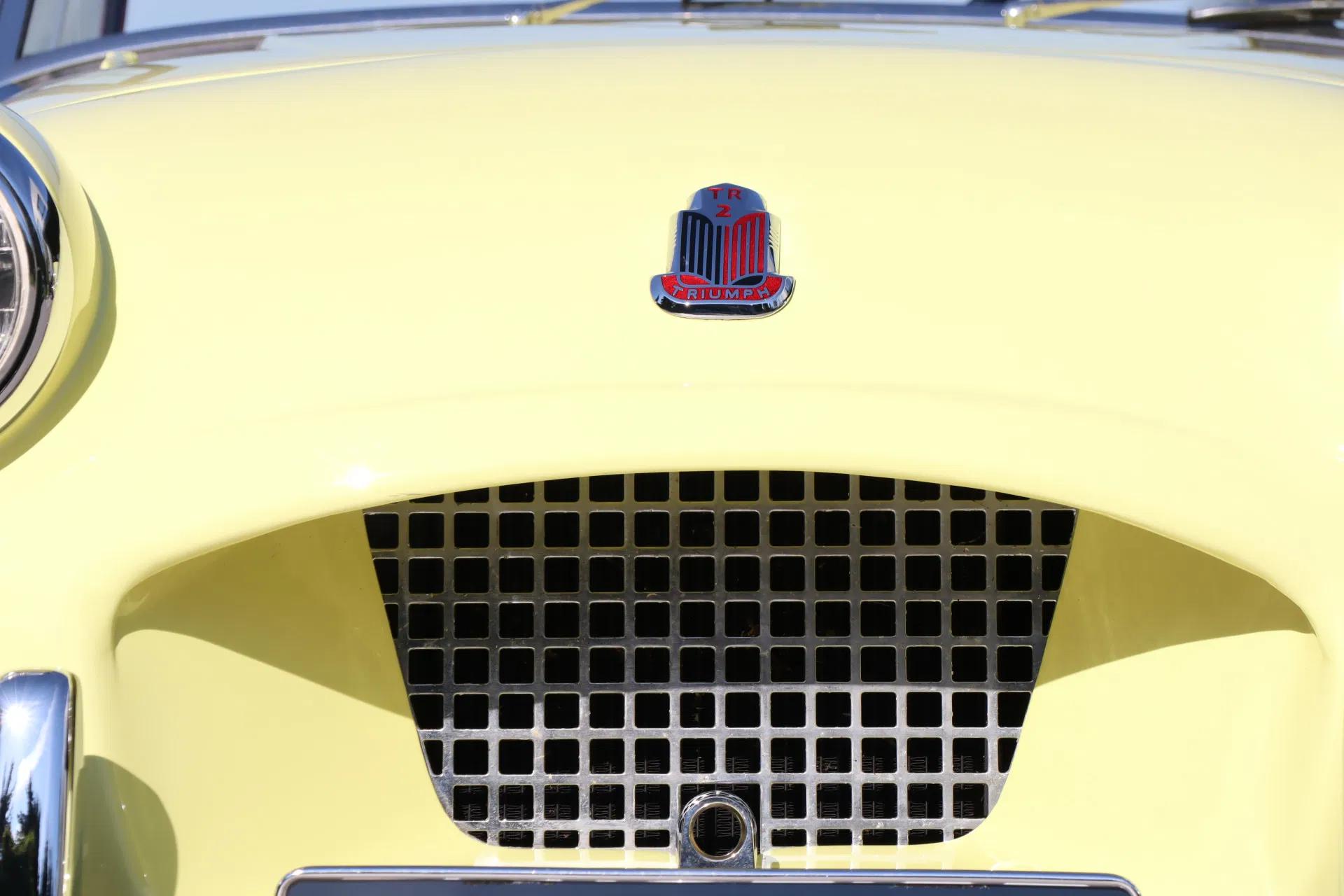 Wat een plaatje: de klassieke uitstraling van de TR2 komt prachtig tot zijn recht in de kleur 'Prime Rose Yellow' en wordt fraai gecontrasteerd met het bordeauxrode interieur. Het betreft hier een vroeg geproduceerd 'Long-Door' model, die te herkennen is aan de lange zijdeuren zonder dorpel aan de onderzijde. De authentieke kleine grille staat ook wel bekend als de 'bomkrater' grille. Het oermodel van de Triumph TR-serie dus. Vanzelfsprekend verkeert de auto optisch in topstaat. In verband met de veiligheid is aan de motorkap een vanghaak toegevoegd. De koplampen zijn van het type P700. De softtop is nieuw, en dus in uitstekende staat. Ook de wielen verkeren in zeer goed staat, met daarin het kenmerkende Triumph logo. Origineel zijn veel chroomdelen op de carrosserie, zoals op de motorkap en zijschermen, bij de eerste serie van de TR2 meegespoten in de kleur van de auto. Omdat dit destijds een extra handeling was kostte dit meer en daarom werden bij latere modellen deze chroomdelen niet meer in de kleur gespoten. De pasnaden van de auto zijn netjes.