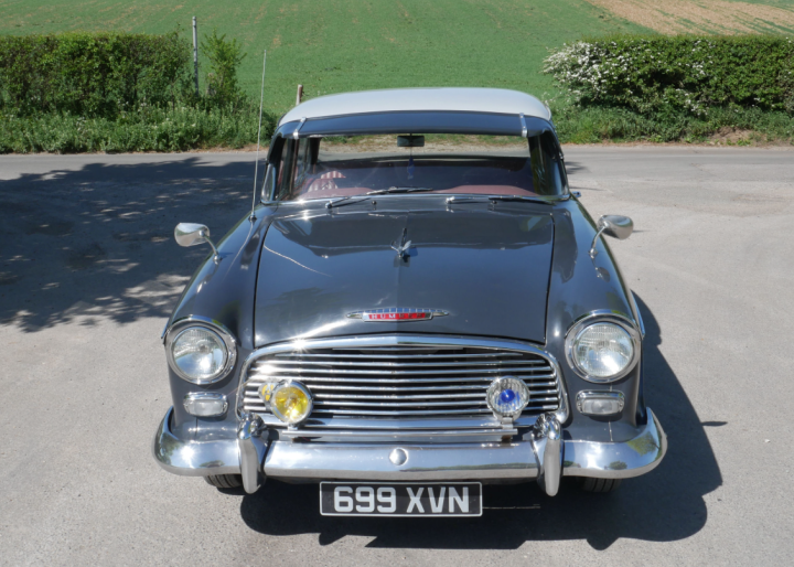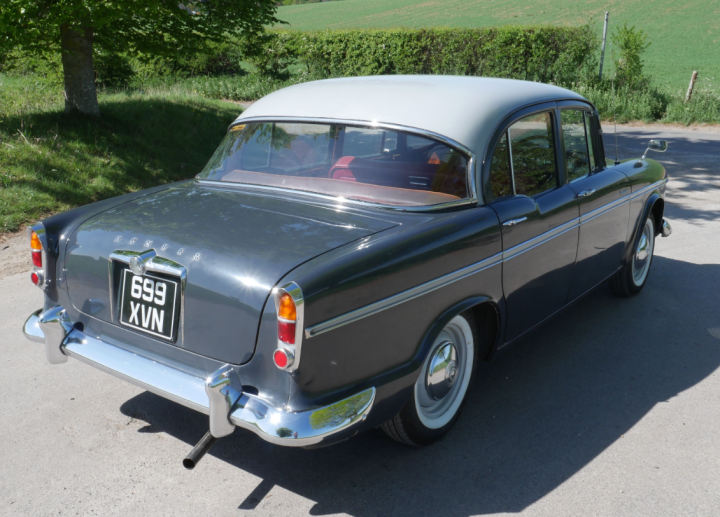 A solid example well presented in two-tone dark grey with light grey coachline and roof, very good red leather interior. Recent service and general overhaul including ignition system, brakes, clutch, Dynator, 5 new tyres, battery, rear shock absorbers etc. and including a new MOT, only 3 owners and possible low mileage. Drives well with 4 speed column gearchange and good brakes (discs on the front). Comes with sun visor, a Rootes Workshop Manual, Lubrication Chart, magazines and some history