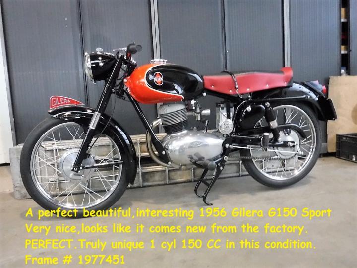 Een zeer mooie, interessante 1956 Gilera G150 Sport. Zeer mooi alsof-ie nieuw zo uit de fabriek komt. Echt uniek 1 cil 150 CC in deze conditie. Frame no is 1977451.Komt met NL kenteken dus rij er mee naar huis. Grootste keus in ECHTE klassiekers met meer dan 450 stuks in de Stolze Collectie: van project tot perfect !